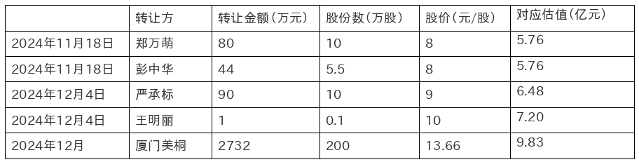 2024 年 12 月,厦门美桐以 13.66 元 / 股转让 200 万股给海玥华,对应估值直接跳涨至 9.83 亿元。