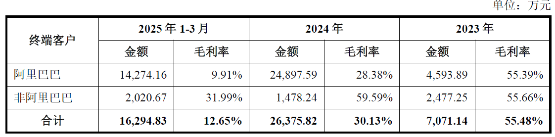 在恒扬数据的智能计算产品中,阿里巴巴系贡献收入的绝对主力,如2024年阿里巴巴作为终端客户贡献公司智能计算产品94.7%的收入,但毛利率从2023年的55.39%下降至2025年第一季度的9.91%,公司所谓毛利率“保持稳定”的迹象尚未出现。
